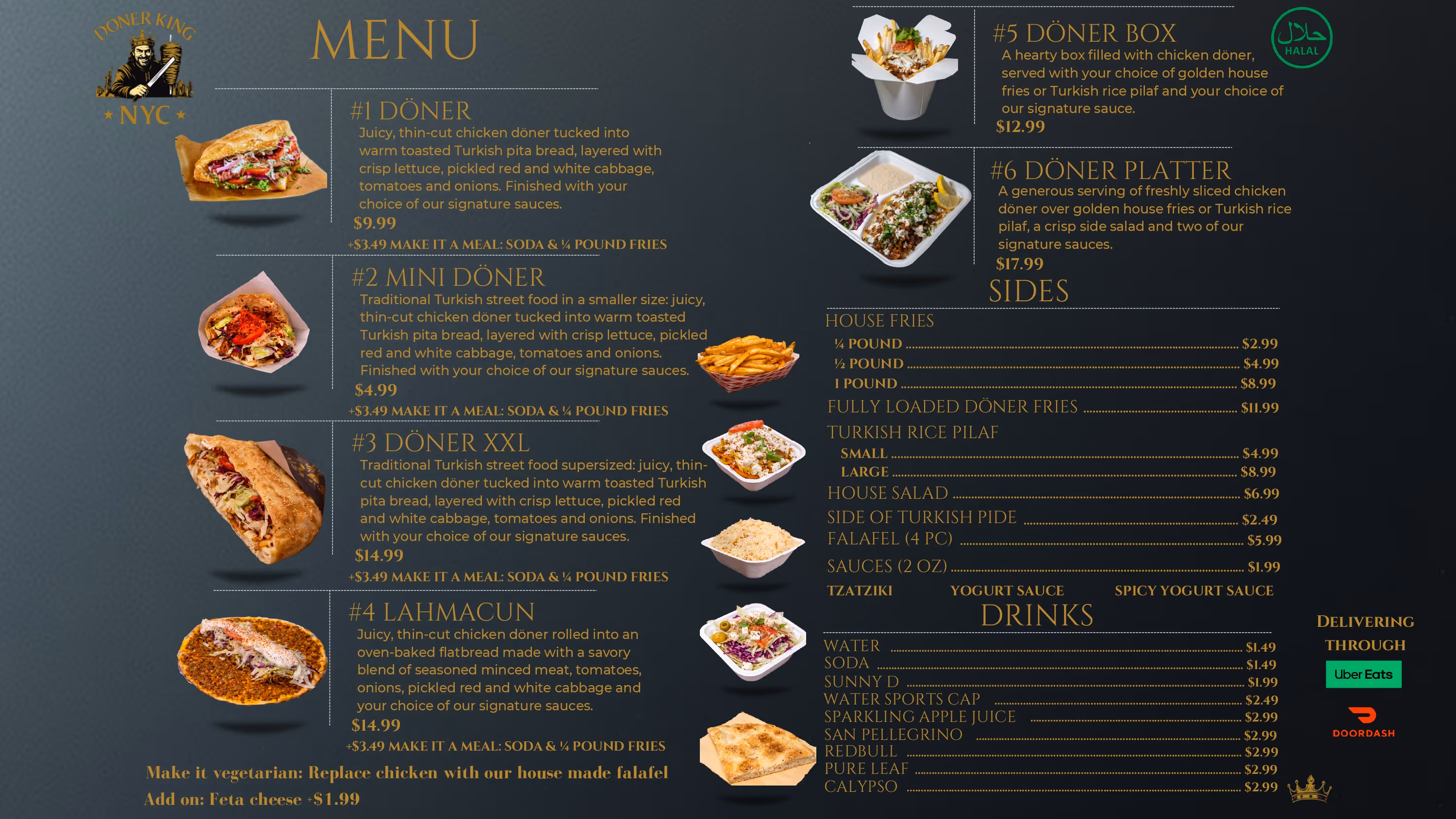 Everything on our menu is prepared fresh daily and made to order. Our signature Döner Kebab sandwich stands at the center of our kitchen, featuring carefully seasoned meat, crisp vegetables, and classic accompaniments that define this beloved street-food staple. Conveniently designed for takeout and delivery, Döner King NYC brings the authentic taste of German döner kebab to the community with quality, freshness, and consistency you can count on.